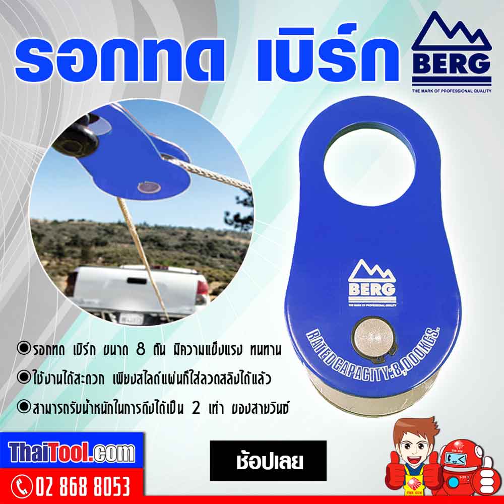 BERG รอกทด ออฟโรด ขนาด 8 ตัน จะมีลักษณะเป็นล้อ โดยสามารถใช้กับสลิง หรือ เชือกได้ ตัวรอกทดมีความแข็งแรง ทนทาน น้ำหนักเบา แต่สามารถรับงานหนักดึงได้ถึง 8,000 กก. ตัวสินค้าสีน้ำเงินสดใส น่าใช้งาน เป็นอุปกรณ์ที่มีประโยชน์อย่างเหลือเชื่อ ในการเพิ่มความสามารถเชื่อมต่อกับยานพาหนะ หรือวินซ์แบบพกพา อุปกรณ์นี้จะช่วยผ่อนน้ำหนักที่วินซ์ลงครึ่งหนึ่งเมื่อใช้สลิงคู่ และ อีกทั้งยังสามารถใช้การเปลี่ยนทิศทางการดึงโดยไม่ทำให้เกิดความเสียหายต่อสลิง หรือ เชือก สามารถนำไปใช้ร่วมกับวินซ์ เพื่อใช้การลากรถที่ติดหล่ม เป็นต้น นอกจากนั้นยังสามารถประยุกต์ใช้กับการทำงานอื่นๆได้ ในกรณีที่ใช้วินซ์ดึงในแนวตรงไม่ได้ ชาวออฟโรดควรมีติดรถไว้