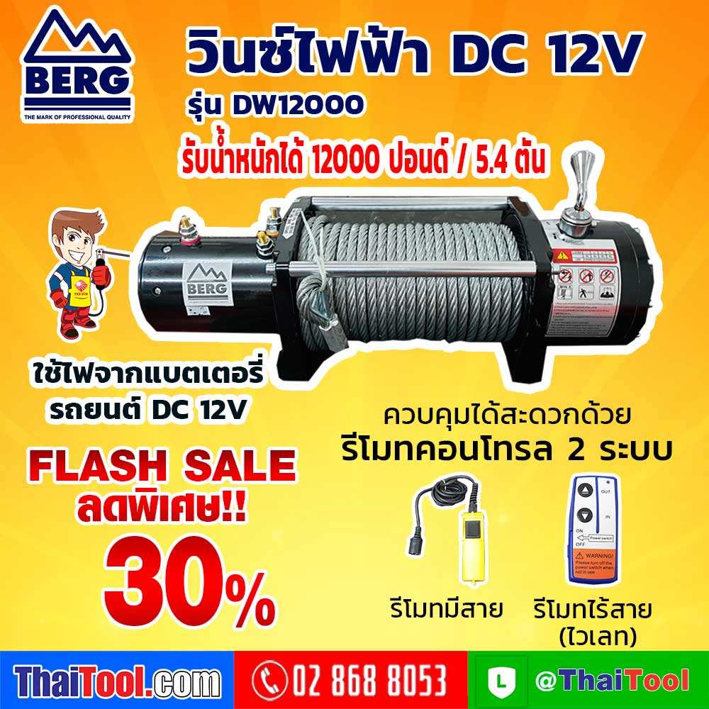 วินซ์ไฟฟ้า DC 12V BERG รุ่น DW12000 รับแรงดึง 12,000 ปอนด์ หรือ 5.4 ตัน เหมาะสำหรับลากรถยนต์ รถเสีย รถติดหล่ม หรือขนย้ายสิ่งของ ใช้กำลังไฟจากแบตเตอรี่ 12 โวล์ มาพร้อมอุปกรณ์ครบ สามารถลากสิ่งของที่มีน้ำหนักได้มาก ควบคุมการทำงานได้ง่าย ด้วยรีโมทคอนโทรล พร้อมใช้งาน ติดตั้งง่าย ใช้งานได้ทุกสถานการณ์